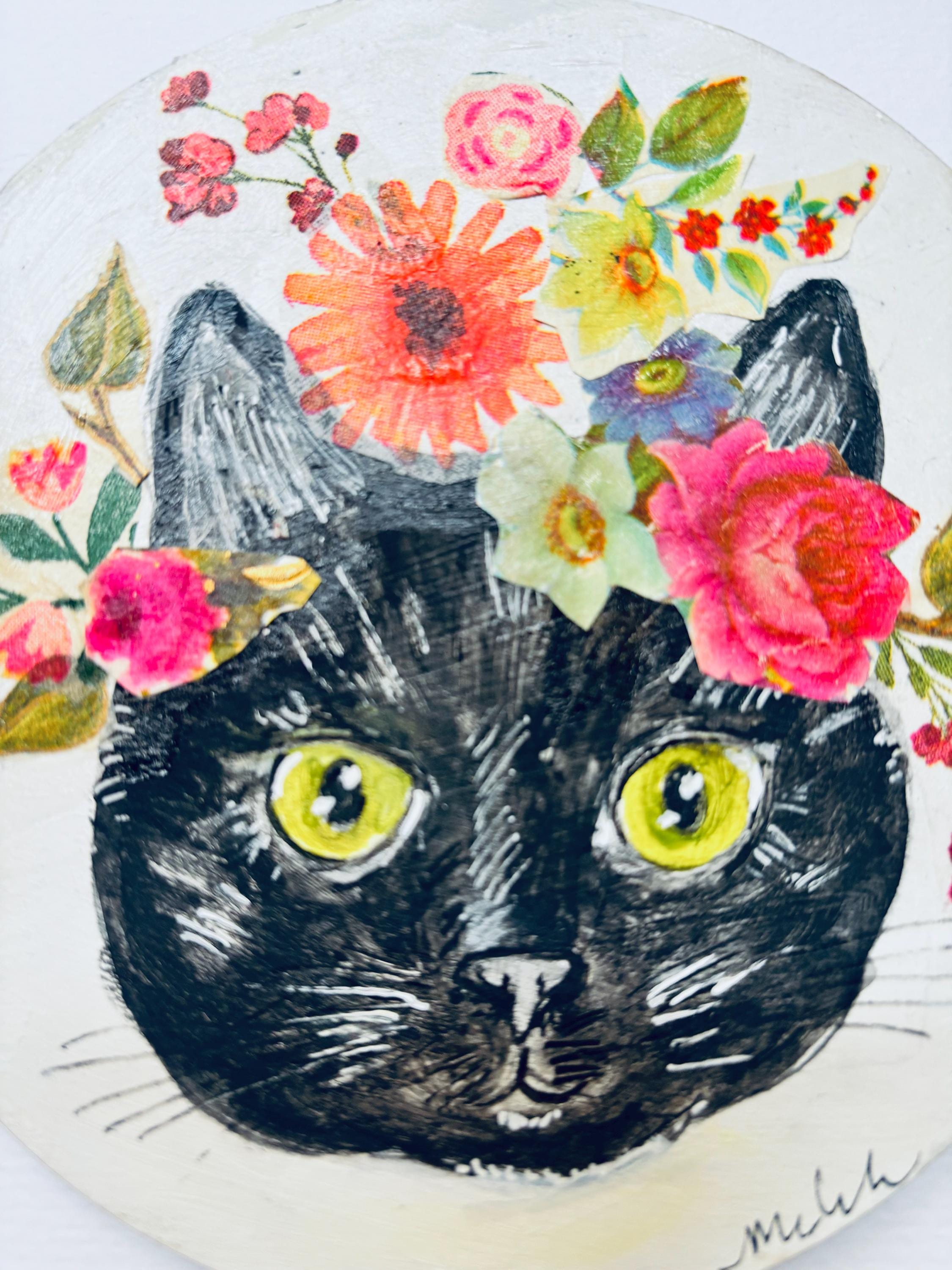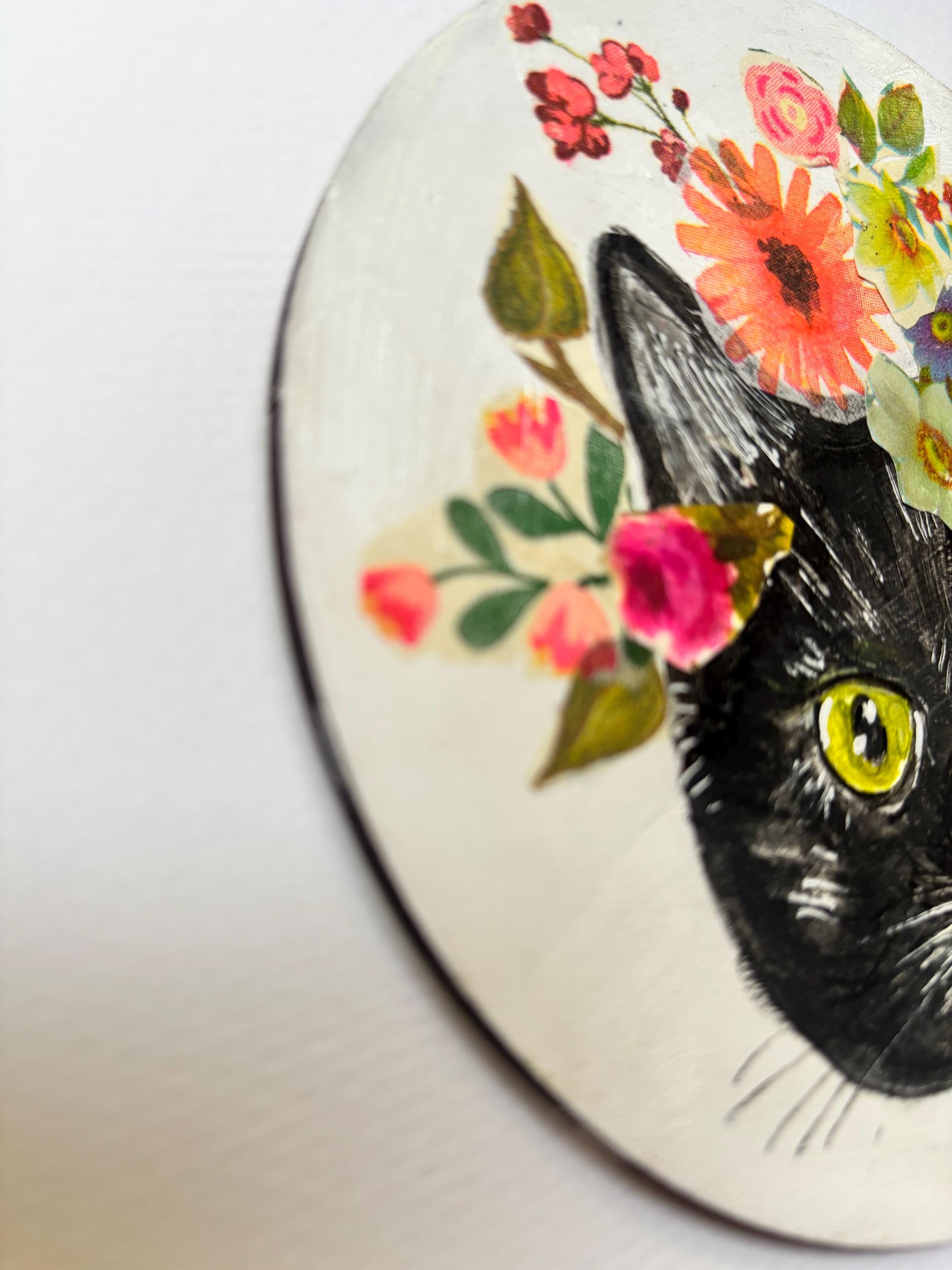 A cute mixed-media feline friend with a floral crown. It is created on a 5 1/2 x 5 1/2 inch round piece of wood. It has a sawtooth hanger on the back, so you can hang your cat friend wherever your heart desires!